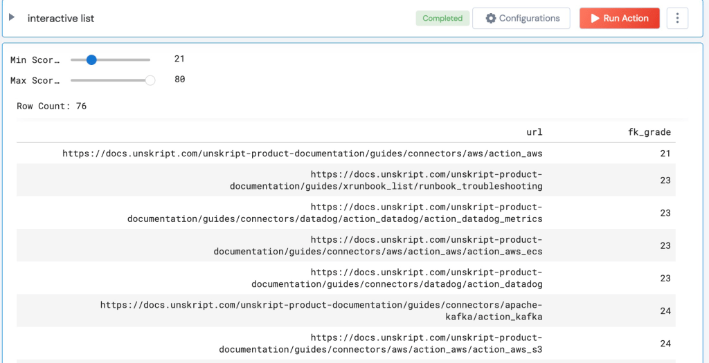 - Action Lists: unSkript has ~500 Drag& Drop actions. To improve visibility of these Actions, we created automated pages that read the name and description of each Action from GitHub. There is a remediation here – we can improve the descriptions in GitHub to improve the readability of these pages.