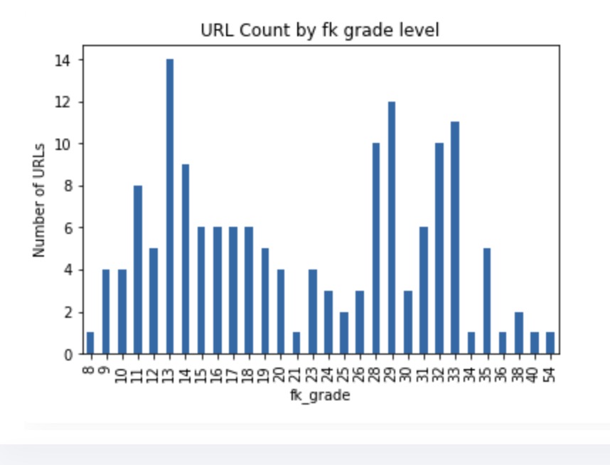 When I run the Flesh_kincade grade metrics across the unskript docs and chart across grade level, I see two distinct peaks:
